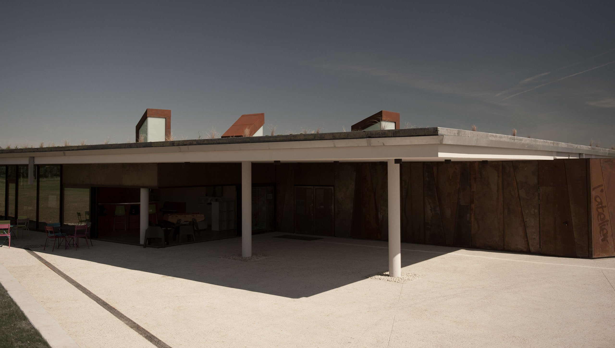 D’une surface de 530 m², il présente une allure résolument contemporaine entre acier, verre et béton qui rappelle ces ateliers d’une industrie disparue. Ce qui caractérise le bâtiment est probablement la lumière qui pénètre les espaces de toutes parts. L’acier rouillé change de couleur au fil des saisons, le toit végétalisé lui offre des allures de tanière secrète, le verre et le béton évoquent le minéral : autant de facettes qui rappellent la diversité des possibilités. Le projet suit son chemin sans jamais trouver une vérité confortable. Cette recherche se fait avec les femmes et les hommes qui vivent aux côtés et à l’intérieur de L’atelier.